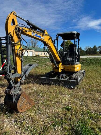 open station canopy over ROPS, hydraulic thumb, hydraulic quick coupler, 21” XCMG tooth digging bucket, straight blade, plumbed for auxiliary hydraulics, front & rear LED lights, pilot controls w/ switchable control patterns, rubber tracks, foot control for main boom pivot, vinyl seat w/ adjustable backrest & seat height.