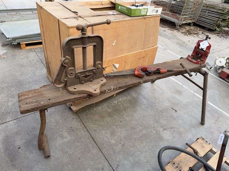 LOT 61 - Wooden Work Bench w/ (2) Pipe Vises & Pipe Cutter