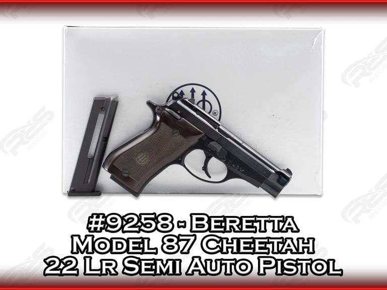 This Beretta Model 87 Cheetah features a 3.5" barrel, metal construction, fixed 3-dot sighting, hammer fired, ambidextrous manual safety, and has checkered hardwood grips. Comes with (2) 10rd magazines, it's original retail box & hard case, cleaning brush and manual.