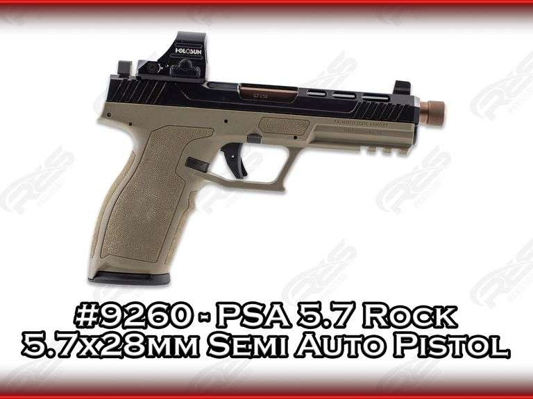This Palmetto State Armory 5.7 Rock features a 5.25" threaded barrel, Tan polymer frame, optics plate cut out slide, suppressor tall fixed sights, no manual safety, an under barrel rail for accessories, and has a textured grip. Comes with (8) 23rd magazines, and the preinstalled Holosun HS407A3 Red Dot Sight.